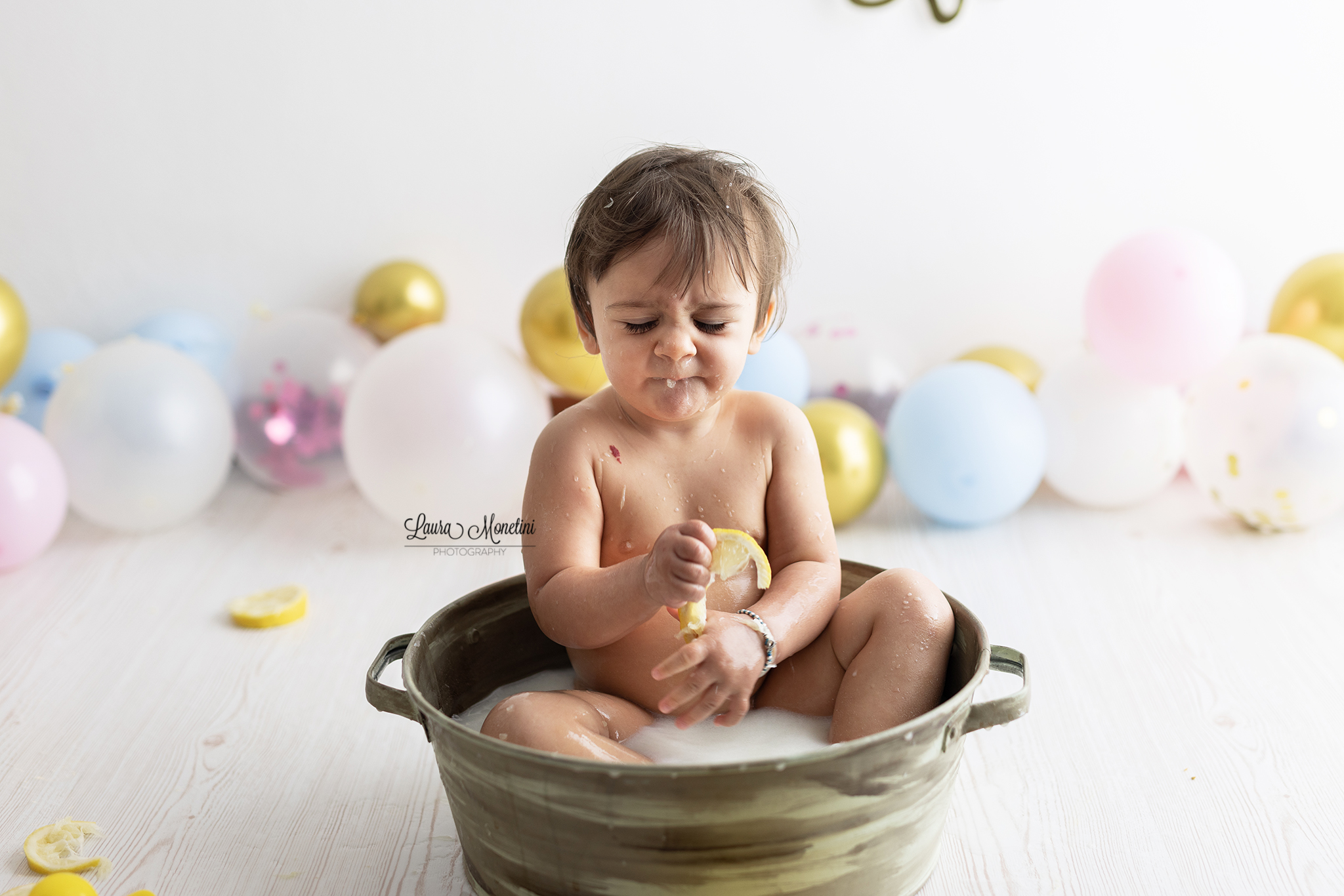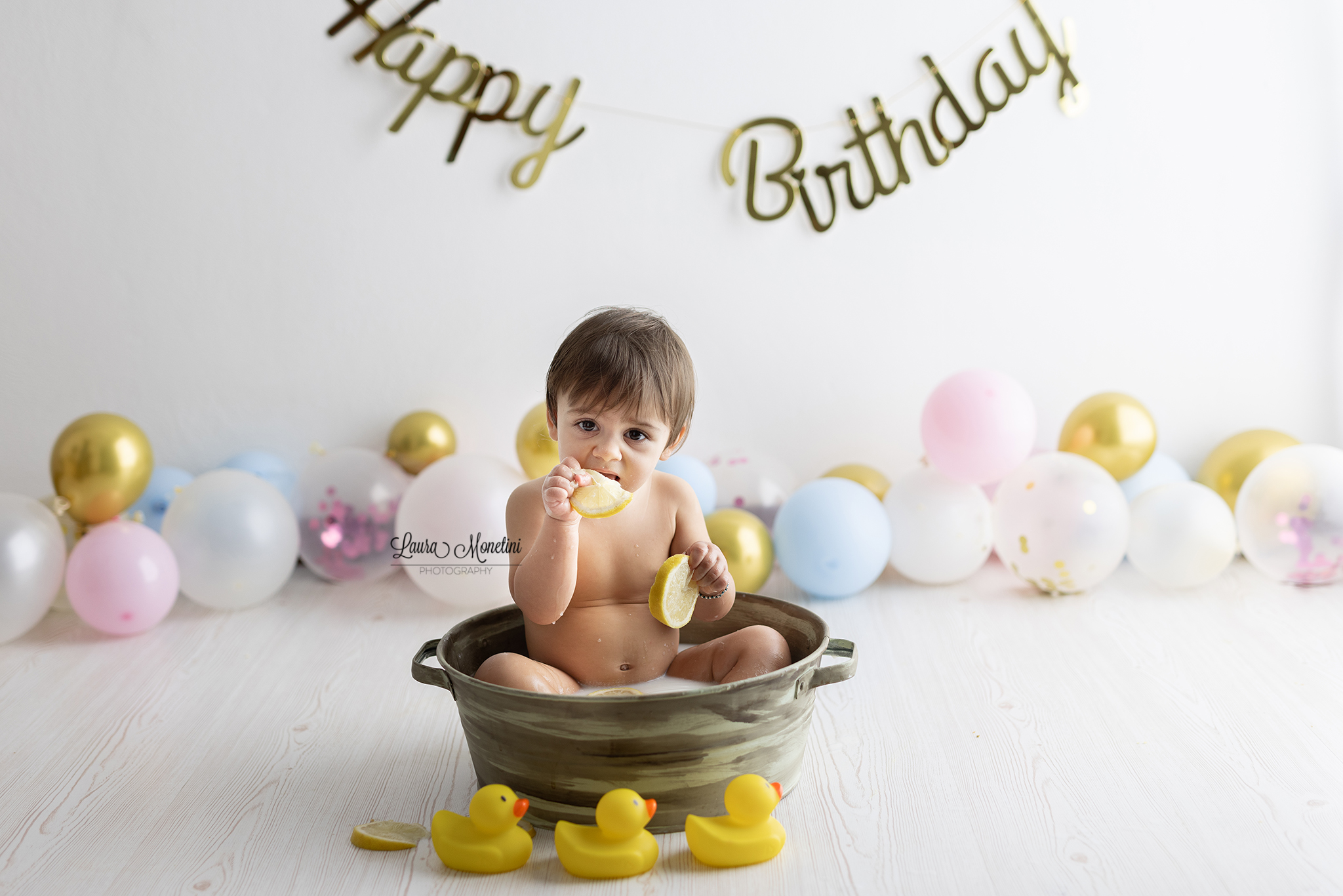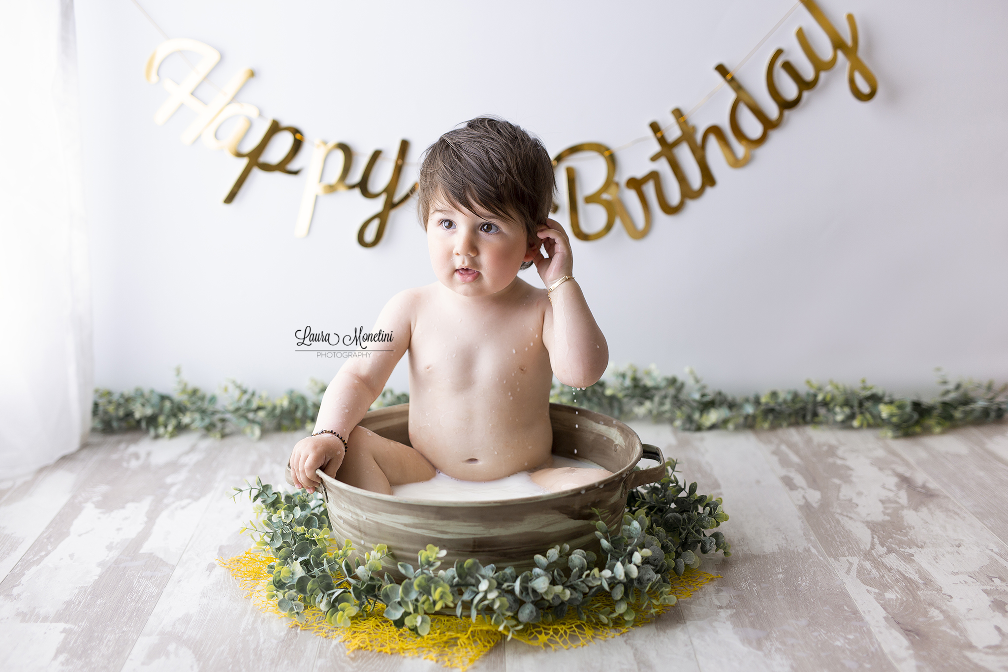 Per il compleanno è incluso un set allestito appositamente, lo smash cake con una torta di pasticceria (naked cake, panna e pan di spagna) con cui il piccolo potrà giocare ed il milk bath, un divertentissimo bagnetto in studio in una soluzione di acqua e latte decorata con fiori o frutti.
